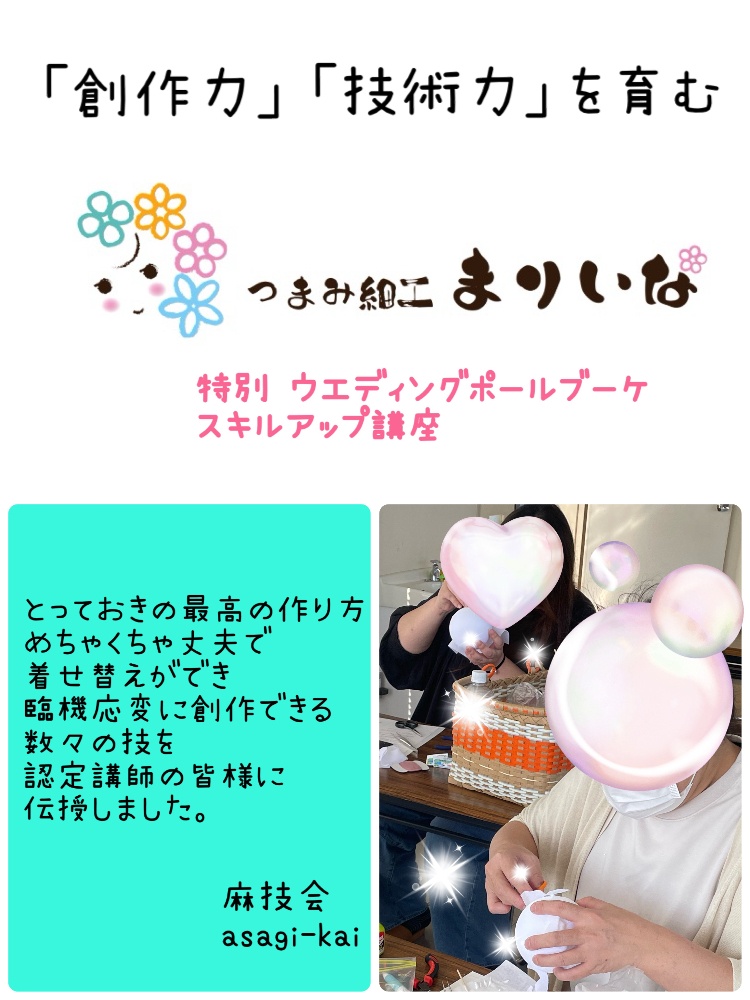 わたしたち一般社団法人つまみ細工アート幾何学協会は、手芸好きの方が知りたかった内容を共有できるホームです。今日は、ウエディングボールブーケを自分らしく作れる方法と、着せ替え可能な丈夫な土台の作り方を認定講師さんに伝授しました。(※麻技会=認定講師の勉強会です)