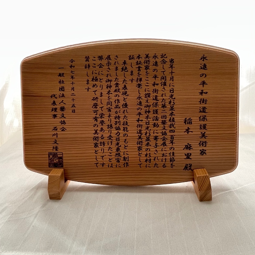 特別協力の世界遺産日光の日光杉並木400年の佳節の記念として開催された第二回藝文協会展【永遠に平和街道保護活動に寄与された美術家】として証されました。つまみ細工絵画を日光東照宮に展示し、同宮の御神木を譲り受けました。これからもいい作品が届けられるよう頑張ります。